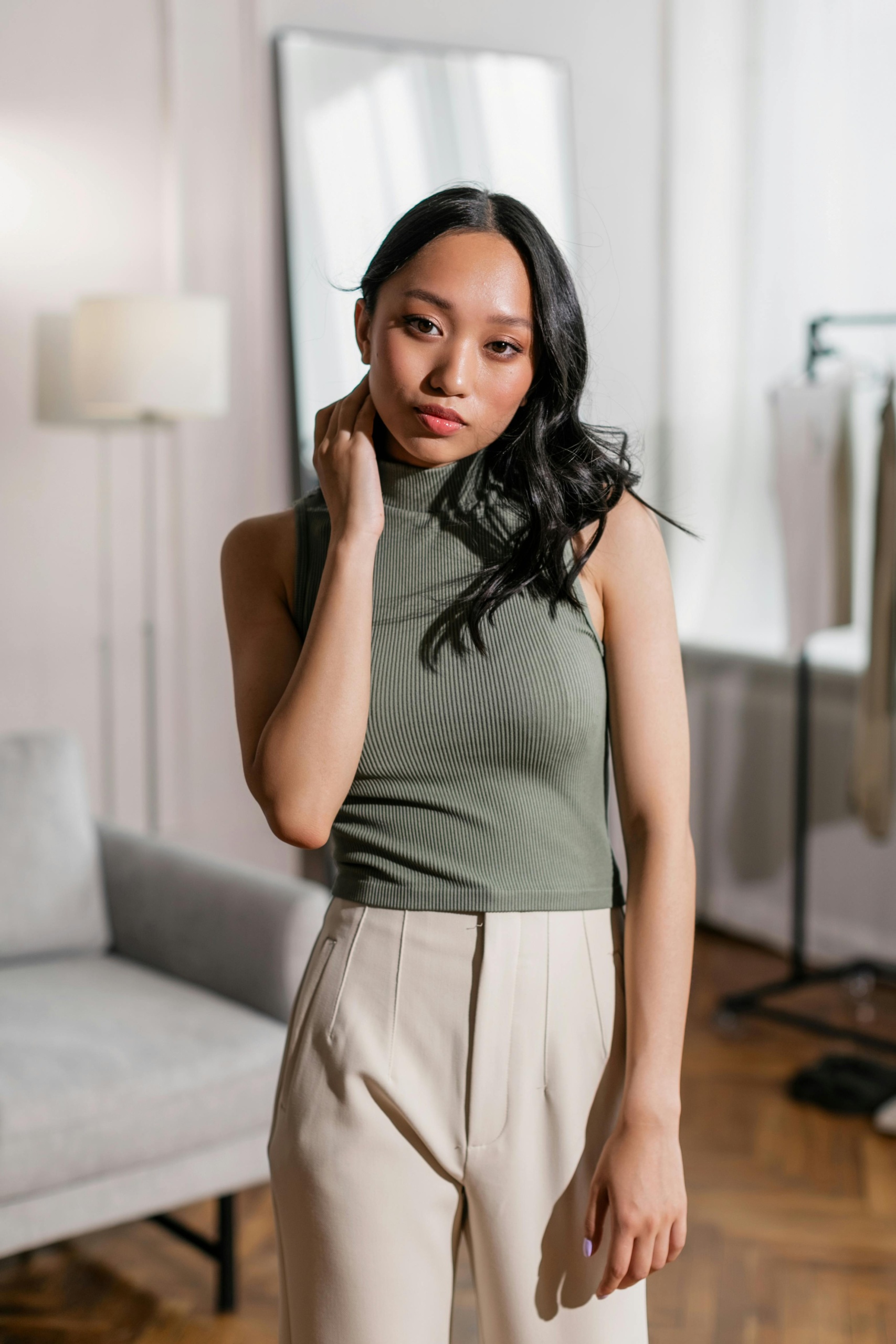 Top verde senza maniche con collo alto, dal taglio aderente che valorizza la silhouette. Il design pulito lo rende perfetto per look moderni e facili da abbinare. Un capo essenziale per outfit eleganti o casual.